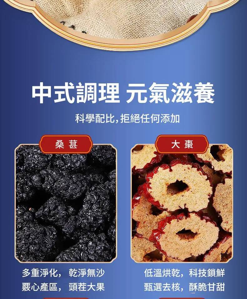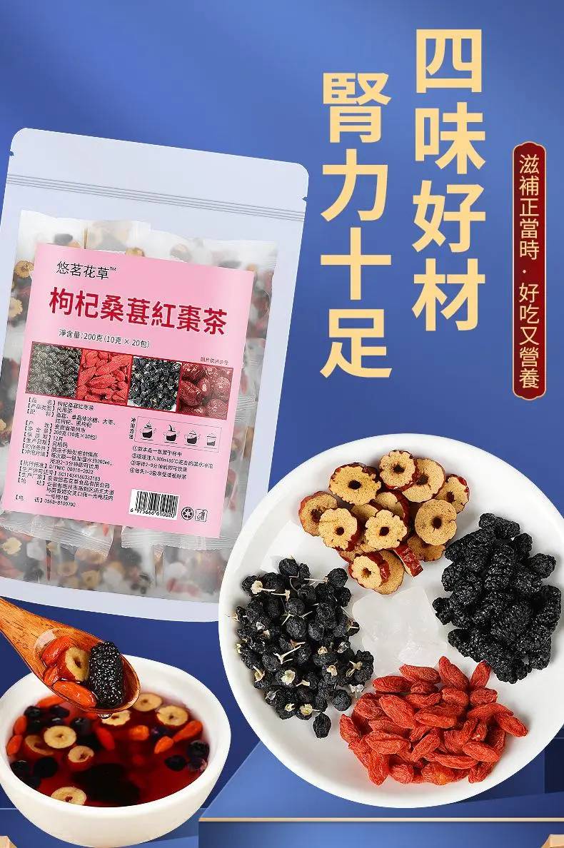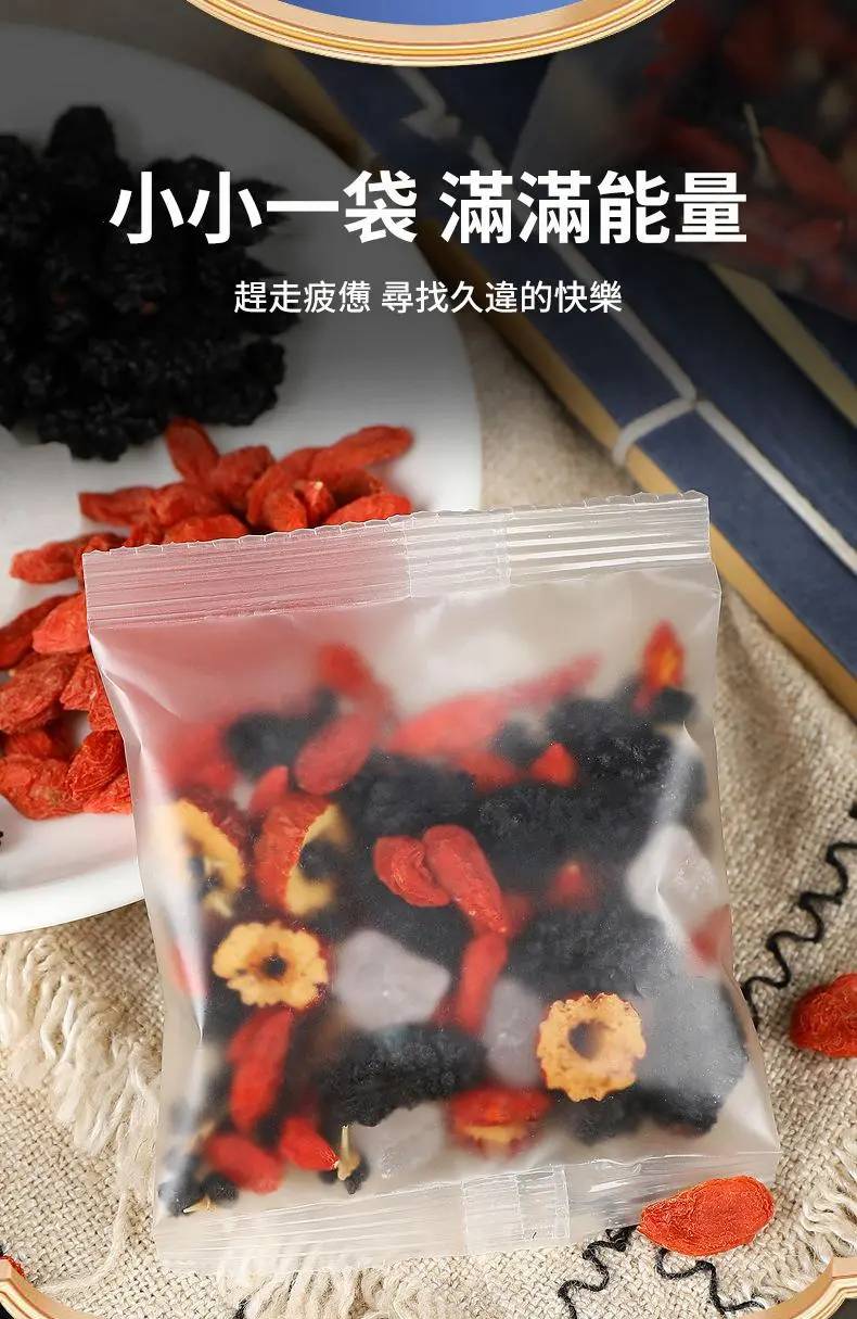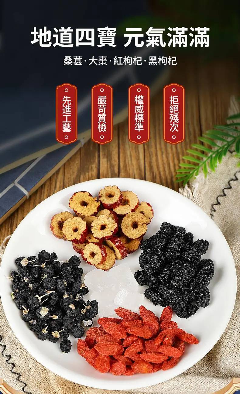 桑葚黑枸杞紅棗茶、滋肝益腎養血增強體力產品的護肝補腎茶包是一個兼具美味和營養價值的養生茶飲品,能夠幫助您增強免疫力,改善體質,並提升整體健康水平。適合: 性質溫和、男女皆宜。嚴選台灣道地本土黑桑椹加上枸杞和紅棗片。